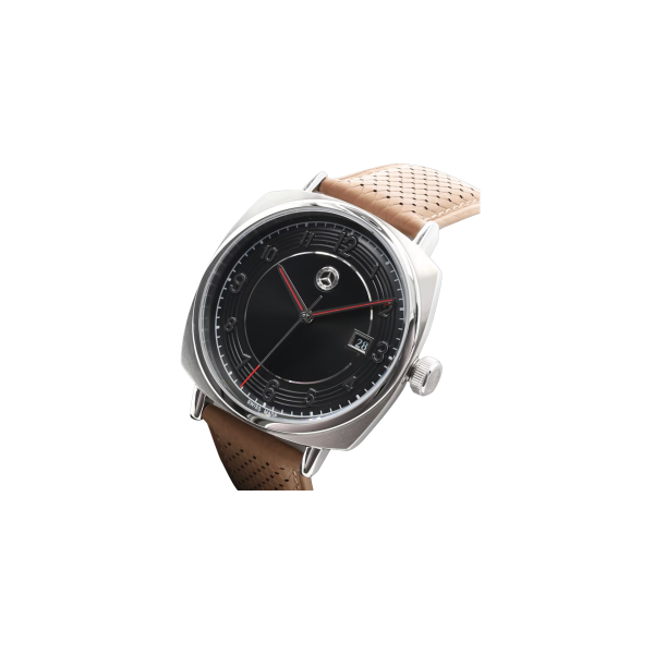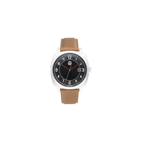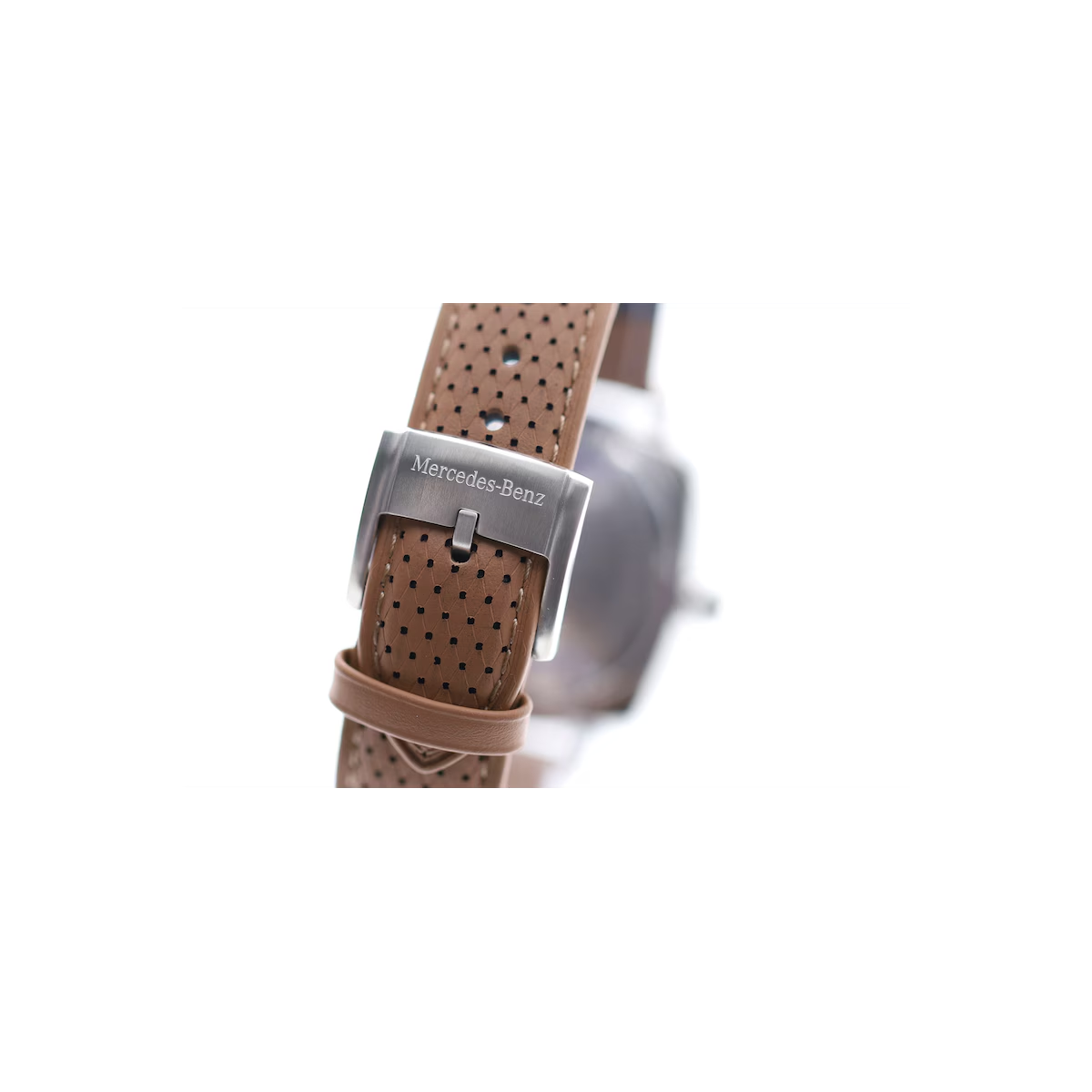 Diese Armbanduhr spiegelt das klassische Design der Mercedes-Benz Pagode wider. Das eckige Gehäuse, die runde Lünette und die Details wie der an den Kühlergrill erinnernde Gehäuserand machen diese Uhr zu einem echten Highlight. Das Kalbslederband mit Prägung und Perforierung bietet höchsten Tragekomfort und erinnert an die legendären Ledersitze des Fahrzeugs.